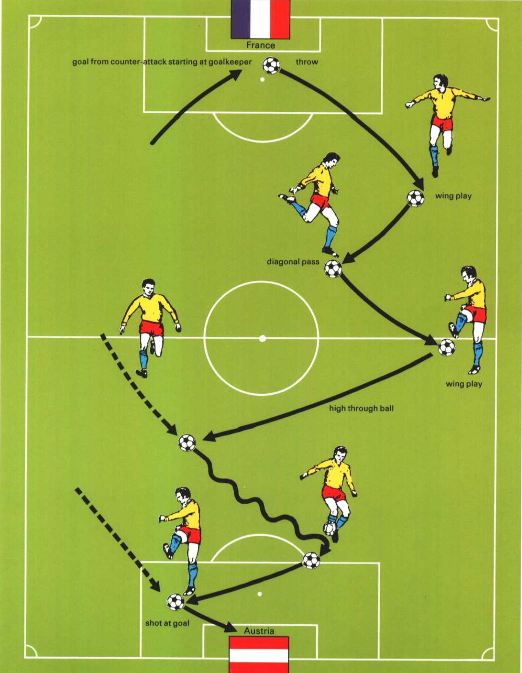 프랑스의 플라티니, 지레세, 징기니, 티가나 선수들은 이곳에서 특히 훌륭한 쇼를 보여주었습니다. 그들이 모두 후방 미드필드에서 공격 쪽으로 전진하면서 공격 플레이를 정해두지 않았습니다. 상대 수비진은 다양한 상황에 직면해야 했기 때문에 이것은 성공적이었습니다. 상대 페널티 지역으로의 침투뿐만 아니라 장거리 슈팅으로 골문을 향해 슈팅하는 네 명의 프랑스 미드필드 선수들의 능력으로 위험은 더욱 커졌습니다. 수비와 미드필드의 기능이 점차 확대되었습니다. 경기 상황에 따라 한 팀의 최전방 공격수들은 중원에서의 역동적인 동작으로 팀의 다양한 공격을 이끌었습니다.