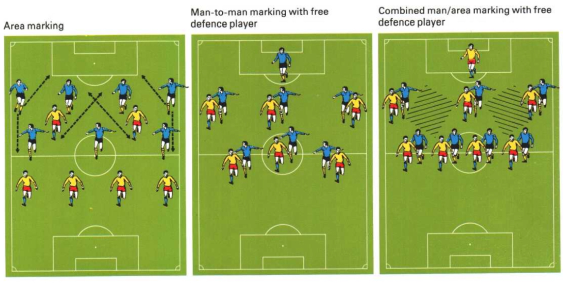 대다수의 팀들은 지역에 따라 자기가 맡아야 할 사람을 마킹하는 명확한 임무를 가지고 경기를 치렀습니다. 맨투맨 방어를 따르는 팀들은 예상되는 상대 공격(스트라이커가 몇 명인지)에 따라 달라집니다. 수비는 자신 앞에 있는 공격수를 마킹하고 미드필더는 공격수 쪽으로 볼이 전달되었을 때는 공을 소유한 사람에게 붙습니다. 이탈리아 수비 조직의 예는 이것의 고전적인 변형입니다.