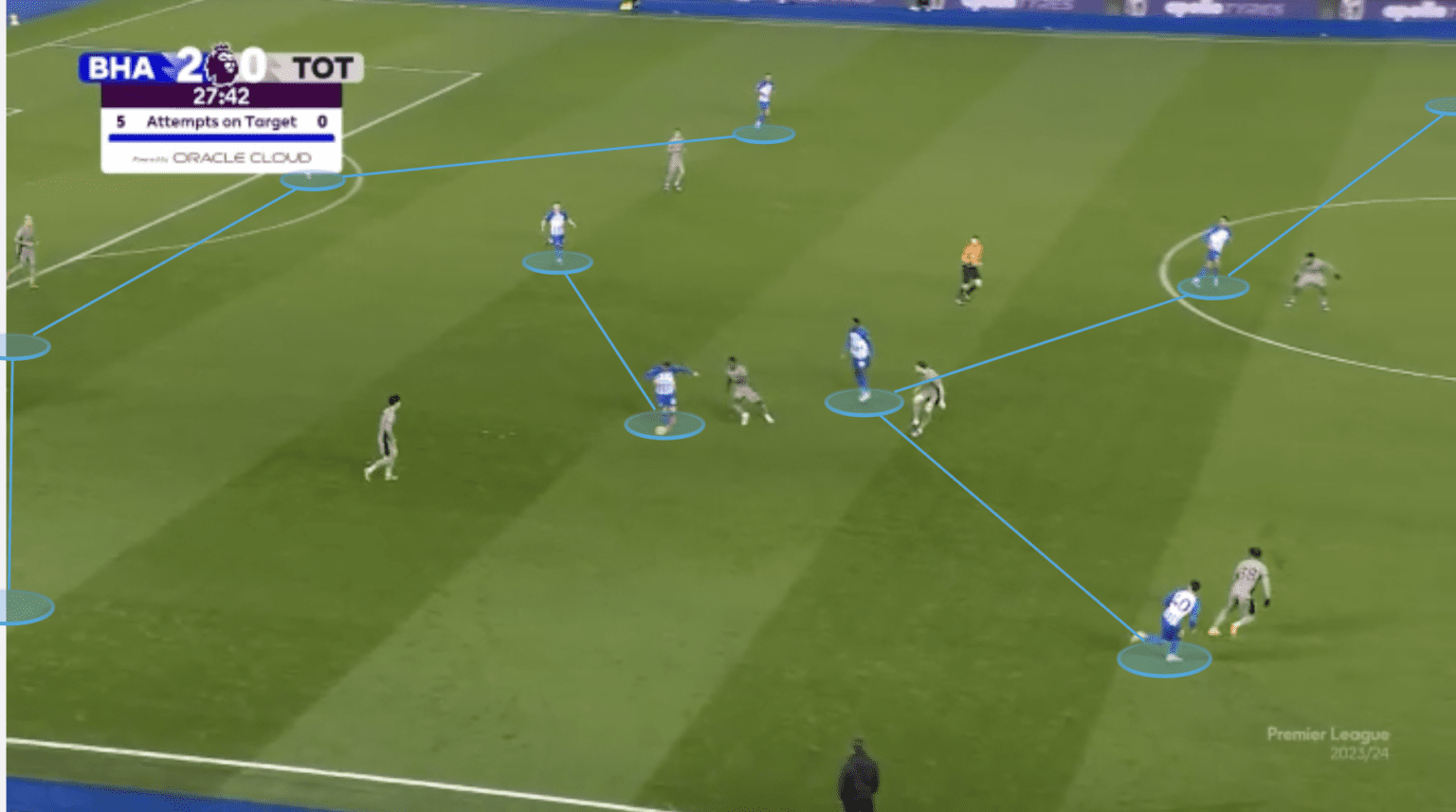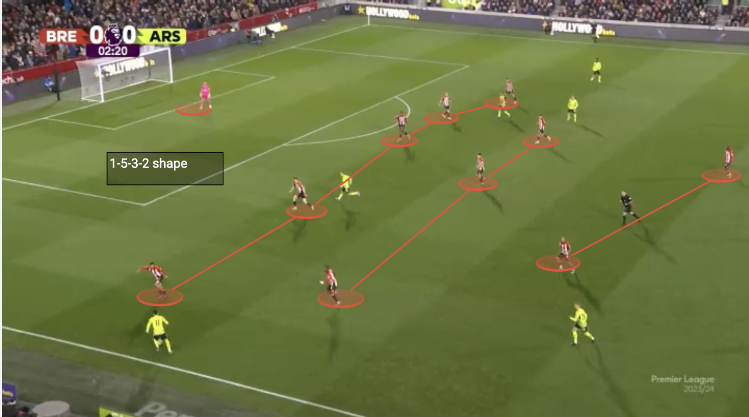 그러나 Brentford는 자기 팀 영역에서는 5-3-2 형태를 사용하여 상대팀이 패스를 하기 어렵게 만든 것을 알 수 있습니다.