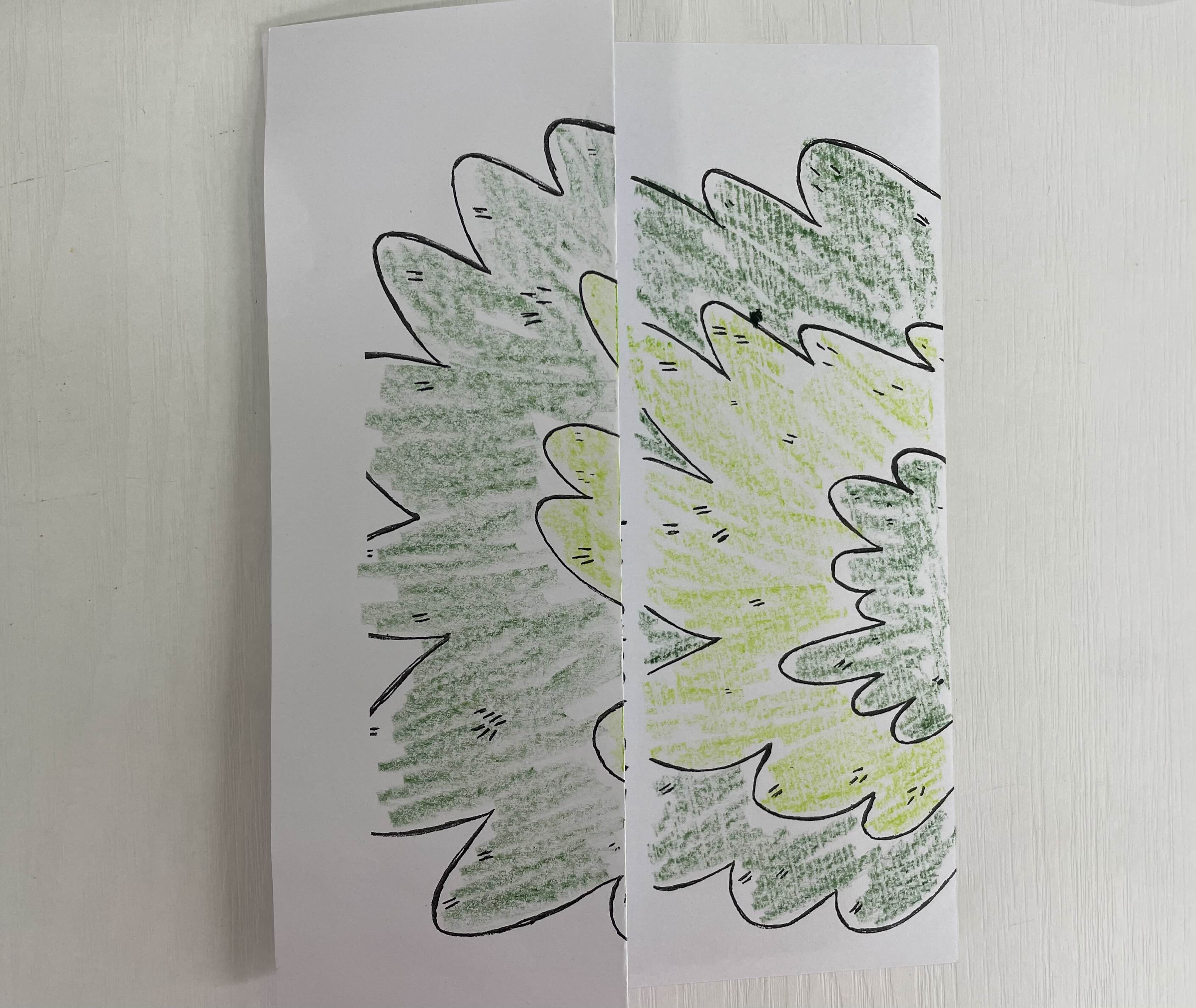 A4 종이를 반으로 접은 후 위쪽 부분만 다시 반을 접어 올리면 아래와 같이 풀 그림이 이어지게 됩니다. 위쪽 풀이 있는 종이를 잡아당겨 펴주면 위에 첨부한 것과 같은 양이 나오게 되지요!