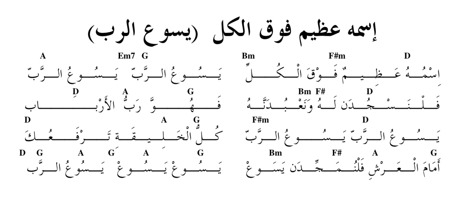 اسمـه عـظيـم فـوق الـكـل يسـوع الـرب يسـوع الـرب فلنـسـجـدن لـه ونعـبـدنـه فــهــو رب الأربـــاب يـسـوع الرب يـسـوع الـرب كـل الخـليـقـة ت