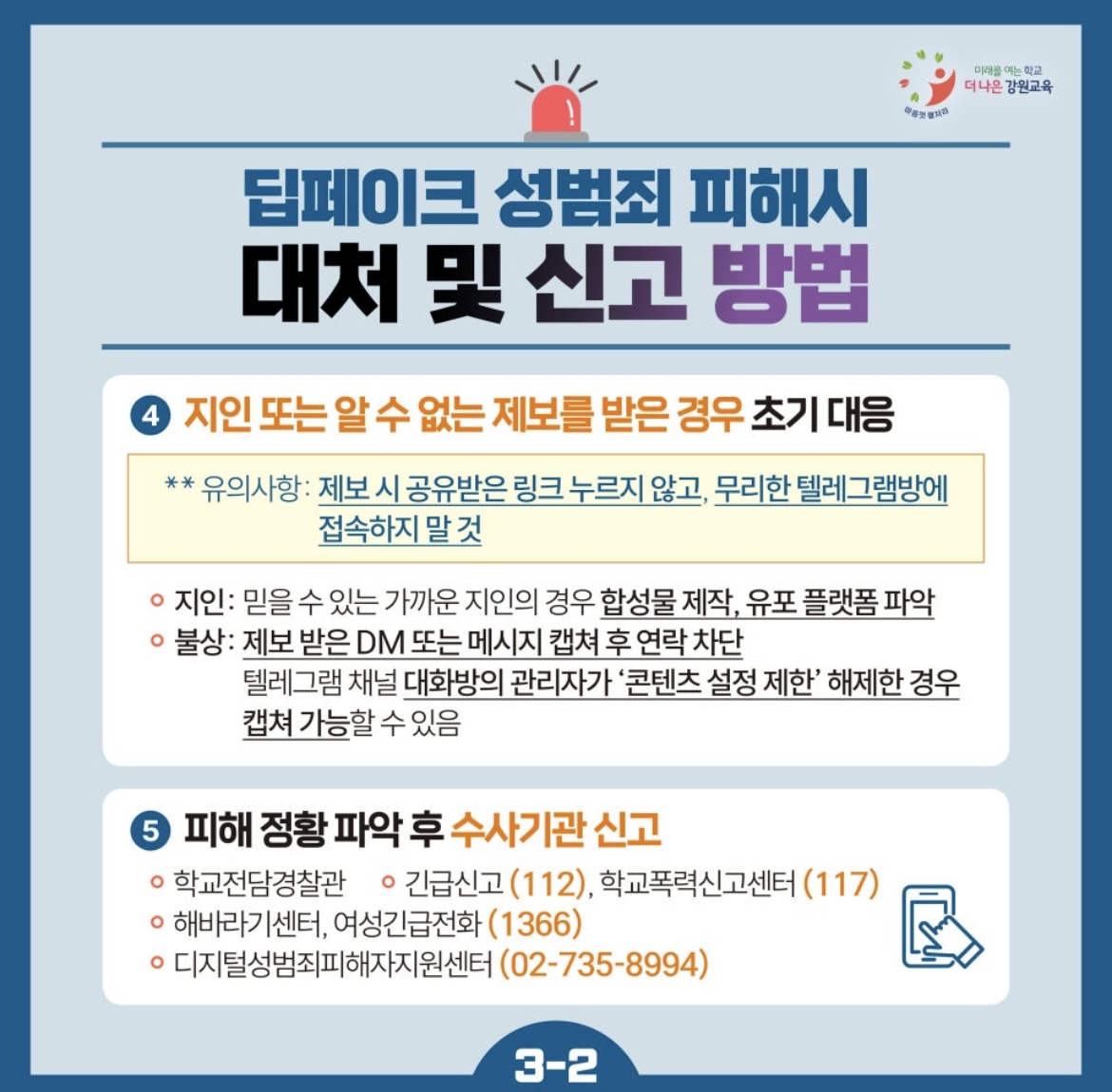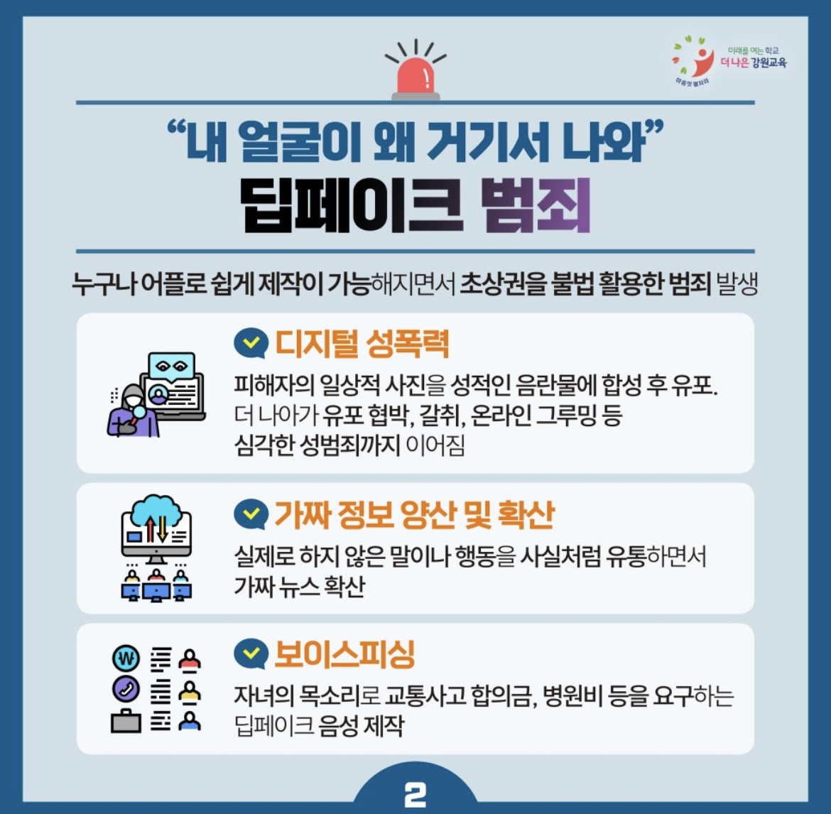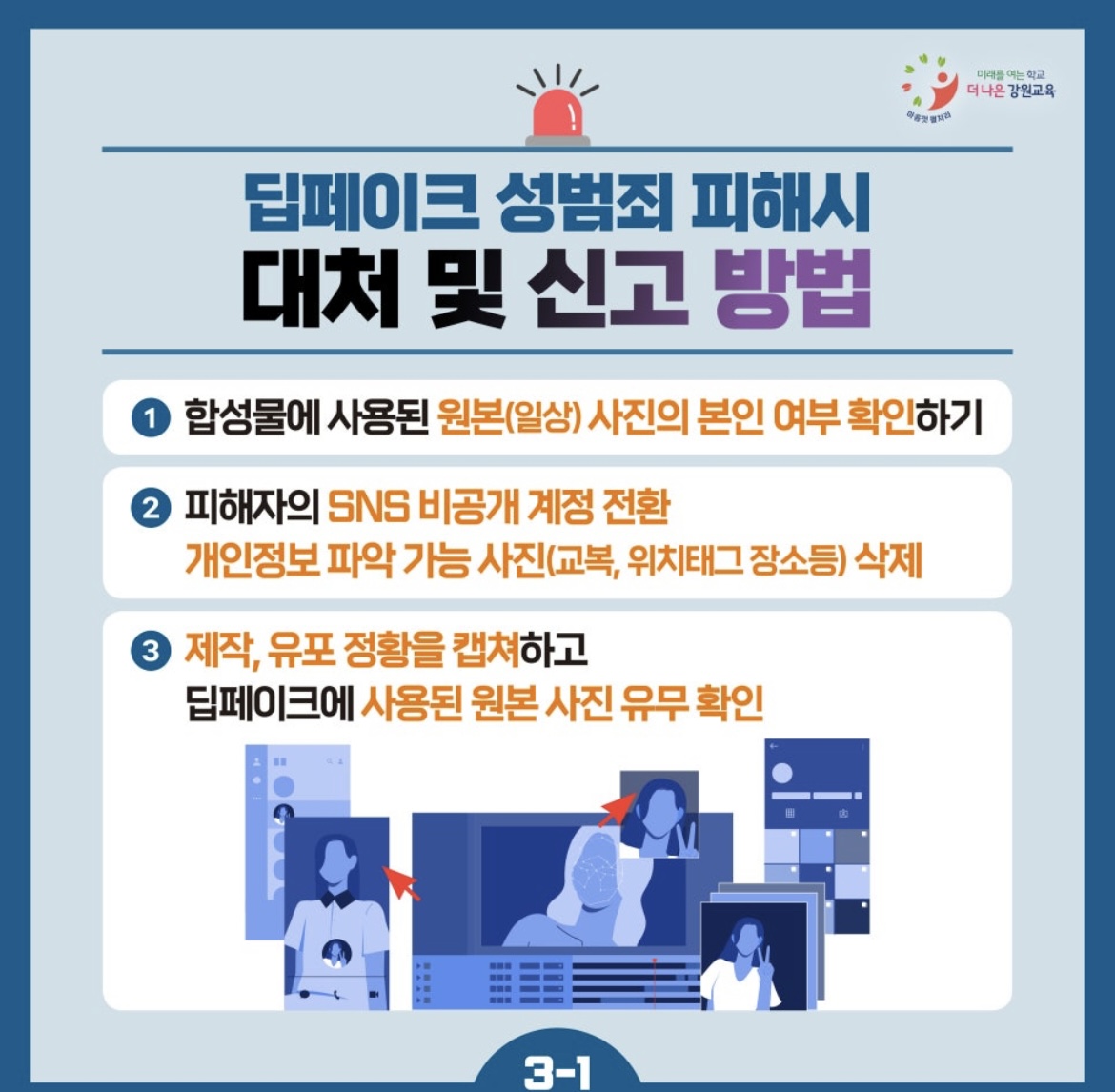 미디어 리터러시 교육 강화: 딥페이크를 쉽게 믿지 않도록 사람들에게 미디어 리터러시 교육을 강화해야 한다. 사람들은 뉴스나 영상을 접할 때 그것이 진짜인지 스스로 판단할 수 있어야 하며, 의심스러운 정보는 여러 소스를 통해 확인하는 습관을 길러야 한다.