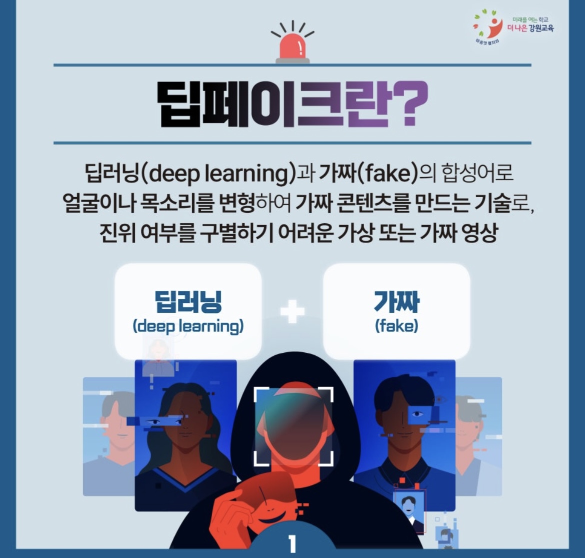 딥페이크는 인공지능(AI) 기술의 한 유형으로, "딥러닝(Deep Learning)"과 "페이크(Fake)"의 합성어이다. 이 기술은 AI의 대표적 기법인 생성적 적대 신경망(GAN, Generative Adversarial Network)을 활용해 실제 사람의 얼굴, 음성, 영상 등을 가짜로 만들어낸다. 이를 통해 실제 존재하지 않는 영상, 음성, 사진을 마치 현실처럼 만들어 내는 것이다.