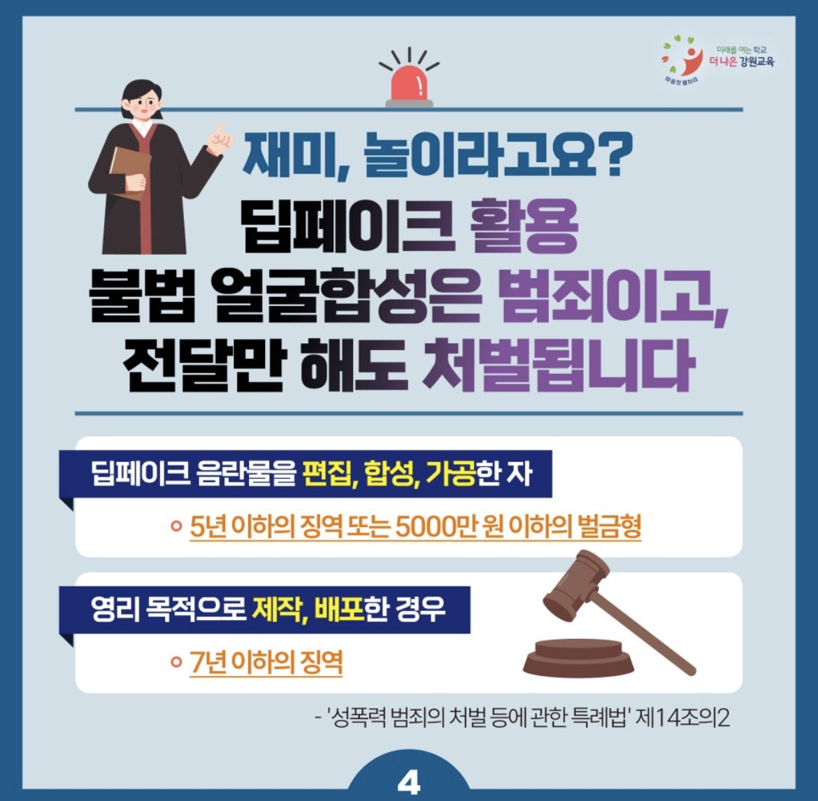 저작권 및 명예훼손 법 강화: 딥페이크로 인해 개인의 이미지나 목소리가 무단으로 사용될 경우, 저작권 및 명예훼손 법에 근거하여 강력히 대응할 수 있도록 법적 근거를 마련해야 한다.