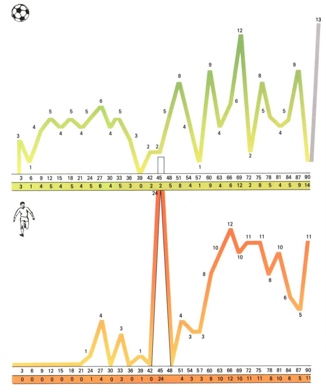 모든 감독은 골과 관련해서도 자신의 경험을 통해 얻은 자신만의 구체적인 방법을 경기에 적용합니다. 스페인의 골은 교체 선수 타이밍과 관련하여 명확하게 유사점이 있다고 볼 수 있습니다. (아래 도표 참조) 전반전에 골이 적게 나오는 경향이 있지만 하프타임 휘슬이 울리기 직전은 분명히 달라집니다. 대부분의 팀들은 36분부터 점수를 내려고 합니다. 후반전에 그래프는 더 분명해지고 더 많은 세부 사항을 보여줍니다. 그래프가 지그재그로 움직이는 것은 다음과 같이 설명될 수 있습니다: 한 골이 득점된 후에는, 득점한 팀은 상대방이 역습을 할 때 위험을 피하기 위해 종종 수비에 집중합니다. 한 골을 내준 팀이라도 다른 골을 내줄 위험을 무릅쓰지 않기 위해 수비적으로 대부분 자제하는 경향이 있습니다. 따라서 경기는 다시 탄력을 받기 전에 잠시 느려집니다. 많은 수의 골이 보통 하프타임 구간 (45분에서 54분 사이) 직후에 나온다는 증거도 있습니다. 아래 도표에서 볼 수 있듯이, 57분에서 72분 사이에 대부분의 골이 득점되었습니다. 앞에서 언급한 그래프의 극단적인 지그재그 선이 이에 대한 명백한 증거입니다. 마지막 공격은 대략 81분에 본격적으로 시작됩니다. 프랑스와 폴란드는 하프타임 구간 전후에 종종 골을 넣었다는 점은 또한 흥미롭습니다.