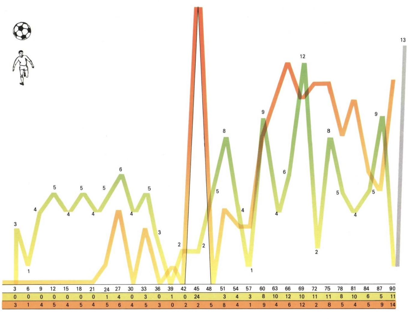 아래 도표가 보여주듯이, 하프타임은 전환점을 나타냅니다. 이 시점에서 선수들을 교체하는 데에는 크게 세 가지 이유가 있습니다: