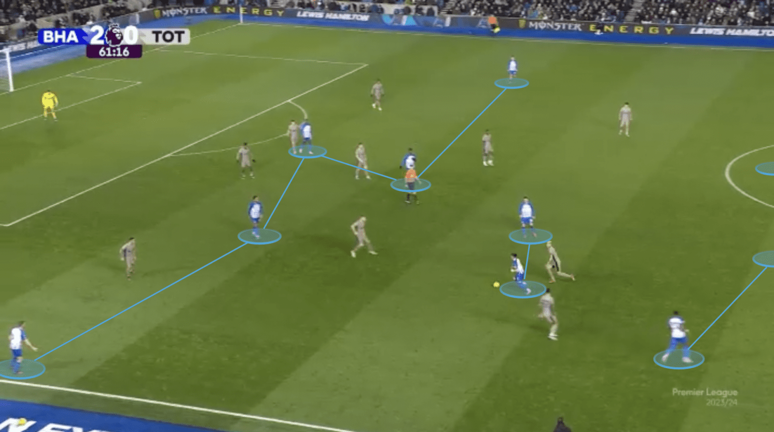 Roberto De Zerbi의 브라이튼의 경우 자기 진영에서 압박할 때에는 주로 4-2-4 포메이션을 사용합니다.