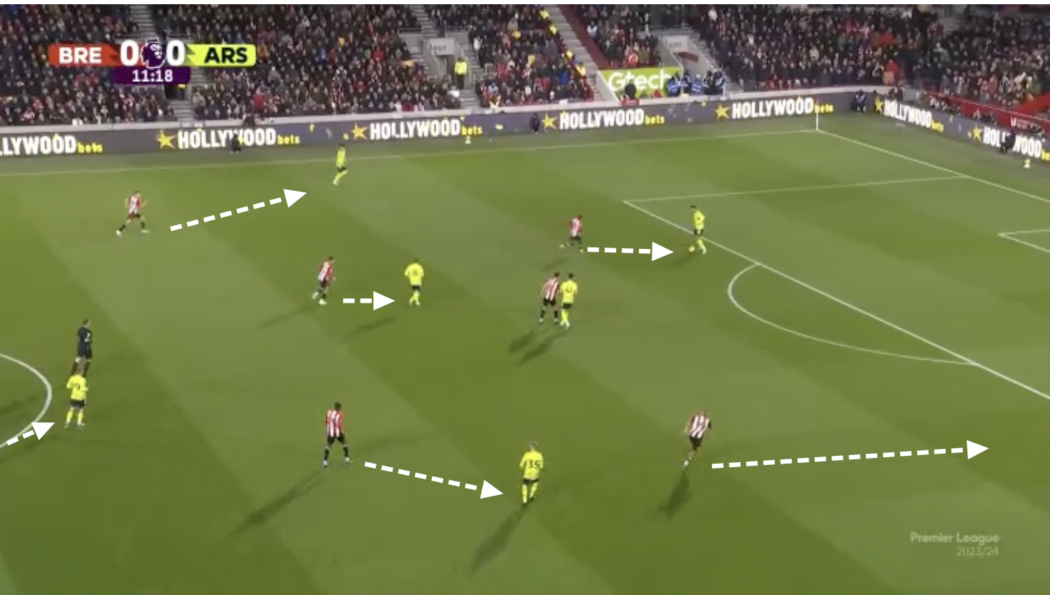 Thomas Frank의 Brentford는 상대팀 진영에서 압박 할 때에는 맨투맨으로 상대편 모양에 맞게 포메이션을 적응시킵니다(3-1-4-2의 형태가 되었네요).